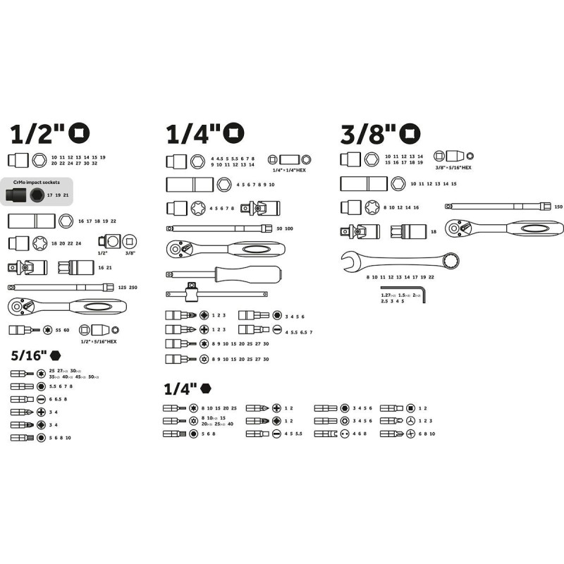 Set Contents Ratchets: 1/4" Drive (45 teeth), 3/8" Drive (45 teeth), 1/2" Drive (45 teeth). Handles: 1/4" Spinner Handle (115 mm), 1/2" Spinner Handle (250 mm). Extensions: 1/4" (50 mm, 100 mm), 3/8" (150 mm), 1/2" (125 mm, 250 mm). Adapters & Universals: 1/4"(F) to 1/4"(Hex) Bit Holder, 3/8"(F) to 1/2"(M) Adapter, 3/8"(F) to 5/16"(Hex) Bit Holder, 1/2"(F) to 5/16"(Hex) Bit Holder, Universal Joints for 1/4", 3/8", and 1/2" drives. Sockets - Standard (1/4" Drive): 4-14 mm. Sockets - Standard (3/8" Drive): 10-19 mm. Sockets - Standard (1/2" Drive): 10-32 mm. Sockets - Deep (1/4" Drive): 4-10 mm. Sockets - Deep (3/8" Drive): 10-15 mm. Sockets - Deep (1/2" Drive): 16-22 mm. Sockets - Spark Plug: 3/8" (18 mm), 1/2" (16 mm, 21 mm). Sockets - E-Torx (1/4" Drive): E4-E8. Sockets - E-Torx (3/8" Drive): E8-E16. Sockets - E-Torx (1/2" Drive): E18-E24. Sockets - Bit (1/4" Drive): Hex, Torx, Security Torx, Phillips, Pozidriv, Slotted. Sockets - Bit (1/2" Drive): Torx T55, T60. Bits (1/4" Hex Shank): Hex, Security Hex, Torx, Security Torx, Spline, Square, Tri-Wing, Torq-Set, Snake Eye, Phillips, Pozidriv, Slotted. Bits (5/16" Hex Shank): Hex, Torx, Spline, Phillips, Pozidriv, Slotted. Wrenches: Combination Wrench Set (8-22 mm), Hex Key (L-Shaped) Set (1.27-5 mm, with duplicates). Screwdriver: 1/4" Bit Driver / Screwdriver Handle. Case: 1 Impact-Resistant Carrying Case.