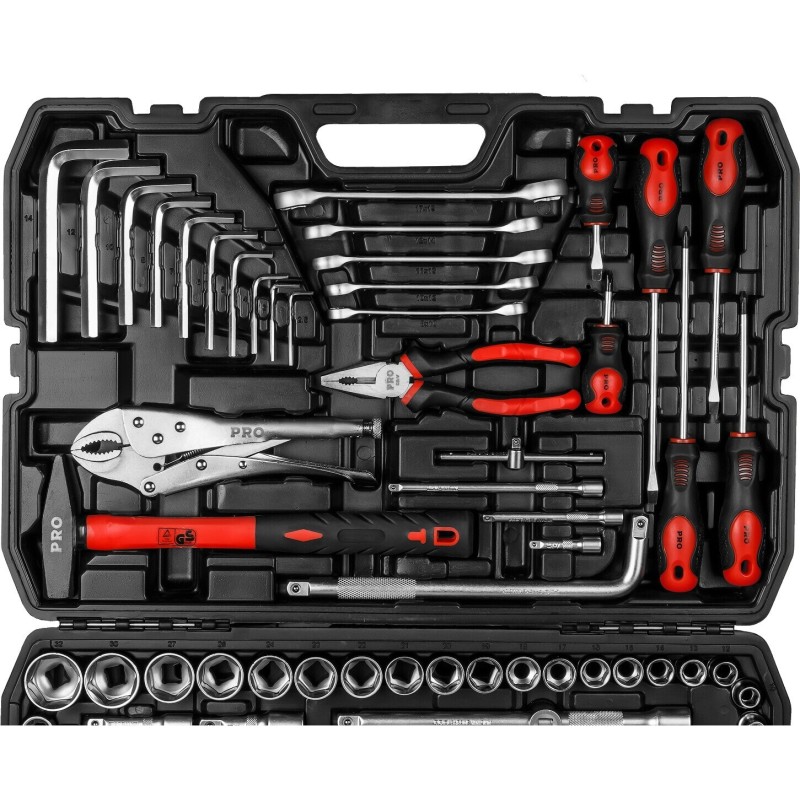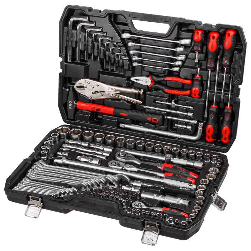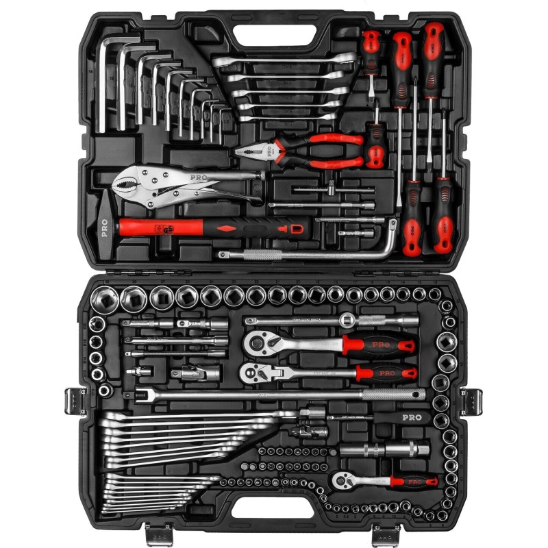 The Tool Set 1/4", 3/8", 1/2" Hexagon 142 pcs PRO STARTUL Stuttgart is a multifunctional kit designed for vehicle repair and maintenance, as well as other mechanical work. The working parts are made of chrome-vanadium steel, providing corrosion resistance. The case is made of durable, impact-resistant plastic with metal locks.