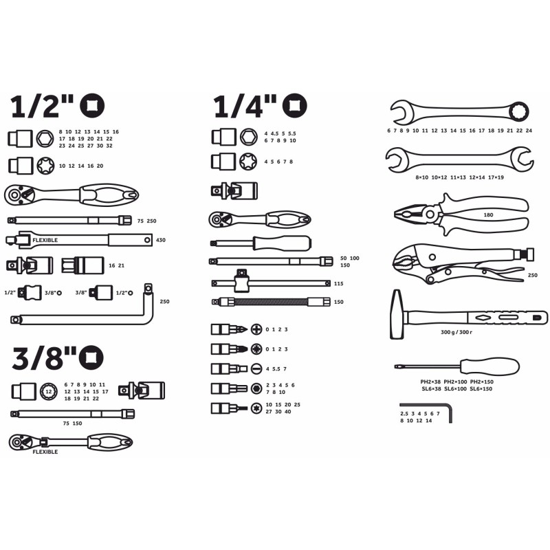 Set Contents Ratchets & Handles: 1/4" Ratchet, 3/8" Flex-Head Ratchet, 1/2" Ratchet, 1/4" Spinner Handle (115 mm), 1/4" Screwdriver Handle (150 mm), L-Shaped Handle (250 mm), Hinge Handle (430 mm). Extensions: 1/4" (50, 100, 150 mm, flexible 150 mm), 3/8" (75, 150 mm), 1/2" (75, 250 mm). Adapters & Universals: 1/2"(F) to 3/8"(M) Adapter, 3/8"(F) to 1/2"(M) Adapter (with hole), Universal Joints for 1/4", 3/8", and 1/2" drives. Sockets (1/4" Drive): Standard (4-10 mm), E-Torx (E4-E8), Bit Sockets (Hex H2-H10, Slotted SL4-SL7, Phillips PH0-PH3, Pozidriv PZ0-PZ3, Torx T10-T40). Sockets (3/8" Drive): Standard (6-22 mm). Sockets (1/2" Drive): Standard (8-32 mm), E-Torx (E10-E20), Spark Plug (16, 21 mm). Wrenches: Combination Wrench Set (6-24 mm), Hex Key (L-Shaped) Set (2.5-14 mm), Adjustable Wrench Set (8x10, 10x12, 11x13, 12x14, 17x19 mm). Pliers & Clamps: Slip Joint Pliers (180 mm), Clamp with Lock (250 mm). Screwdrivers: Phillips (PH2 x 38, 100, 150 mm), Slotted (SL6 x 38, 100, 150 mm). Hammers: Fiberglass Handle Hammer (300 g). Case: 1 Impact-Resistant Carrying Case.