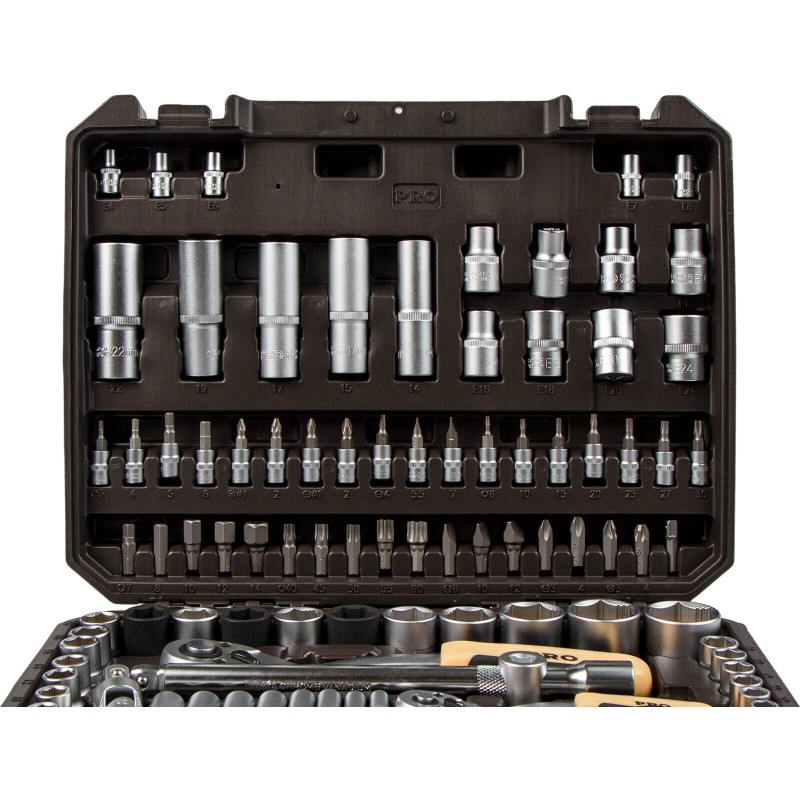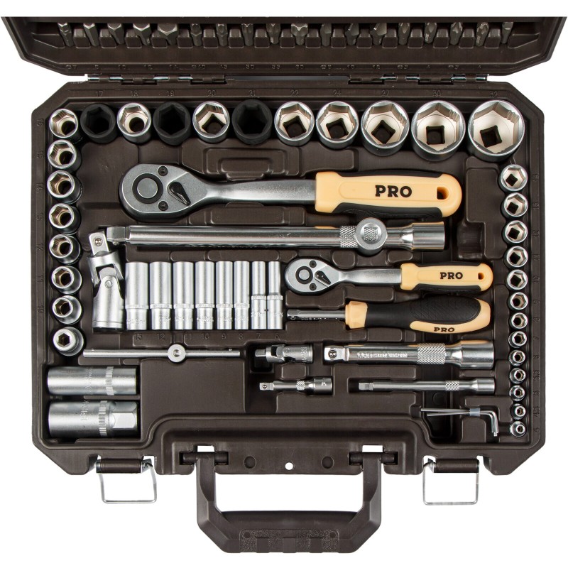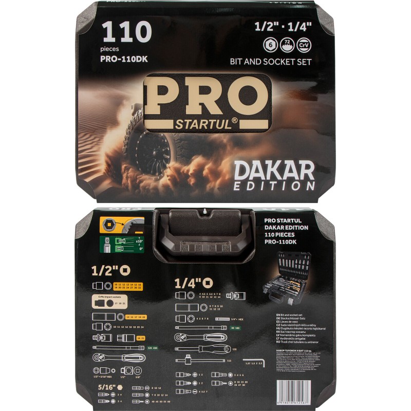 The PRO STARTUL Dakar 110-piece set is engineered for the professional automotive technician. It features advanced tools like anti-slip socket profiles, floating extensions, and impact-rated sockets. This comprehensive set, packed in a rugged case, is built to handle demanding repairs and maintenance on vehicles and machinery.