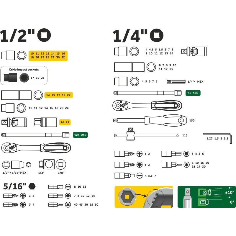 | Set Contents | Ratchets: 1/4" Drive, 1/2" Drive. Handles: 1/4" Spinner Handle (150 mm), 1/4" Flex-Head Driver (115 mm). Extensions: Floating 1/4" (50 mm, 100 mm), Floating 1/2" (125 mm, 250 mm). Adapters: 1/2" to 5/16" Hex Bit Holder, 3/8"F to 1/2"M Adapter, 1/4" Drill Adapter. Universal Joints: 1/4", 1/2". Sockets (1/4" Drive): Standard (4-14 mm), Deep (6-13 mm), E-Torx (E4-E8), Bit Sockets (Hex H3-H6, Torx T8-T30, Slotted, Phillips, Pozidriv). Sockets (1/2" Drive): Standard (10-32 mm), Impact (17, 19, 21 mm), Deep (14-22 mm), E-Torx (E10-E24), Spark Plug (16, 21 mm). Bits (5/16" Hex Shank): Hex (H7-H14), Torx (T40-T60), Slotted (SL8-SL12), Phillips (PH3, PH4), Pozidriv (PZ3, PZ4). Hex Keys: L-Shaped (1.27, 1.5, 2, 2.5 mm). Case: 1 Heavy-Duty Case with Handle. |