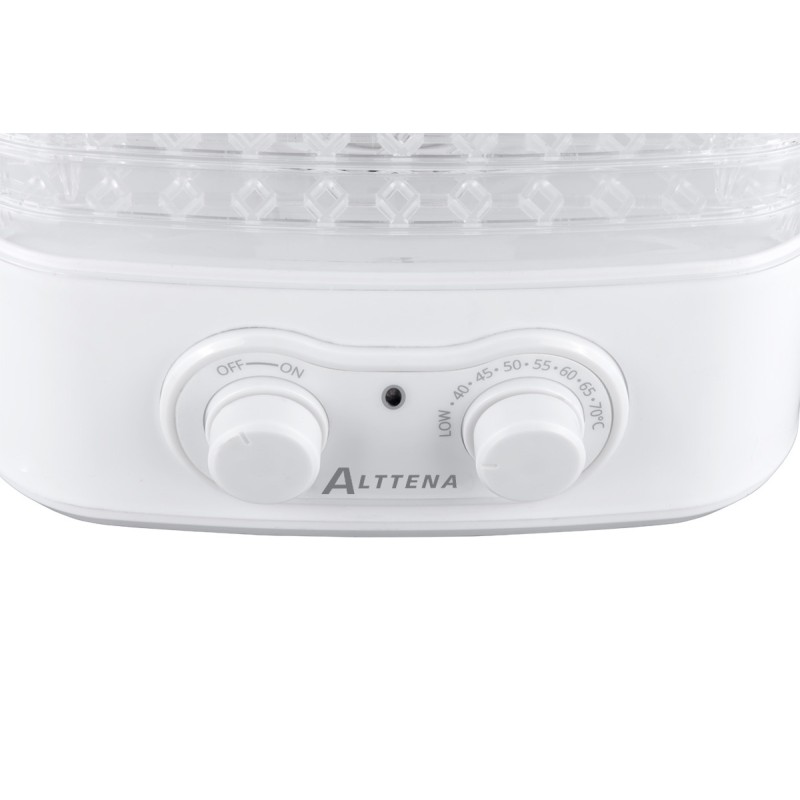 The ALTTENA AFD-801 food dehydrator is designed for processing fruits, vegetables, and other foods for long-term storage while preserving their nutritional value. This device can dry fruits, vegetables, berries, mushrooms, bread, herbs, and much more. You can set the required drying temperature depending on the type of product. Heated air circulates through the trays, causing moisture to evaporate from the food. The duration of drying depends on the moisture content and size of the items being processed.