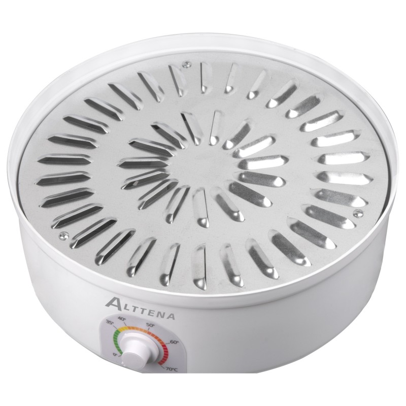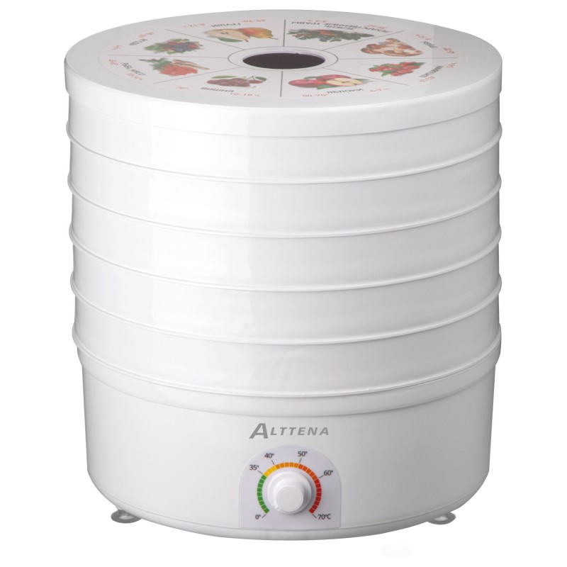 The ALTTENA AFD-904 food dehydrator features 5 large removable trays with 25 mm spacing between levels. The trays and lid are made of durable plastic. It offers adjustable temperature control from 35 to 70 degrees Celsius. The convection function, powered by a built-in fan, increases the efficiency and speed of the drying process.