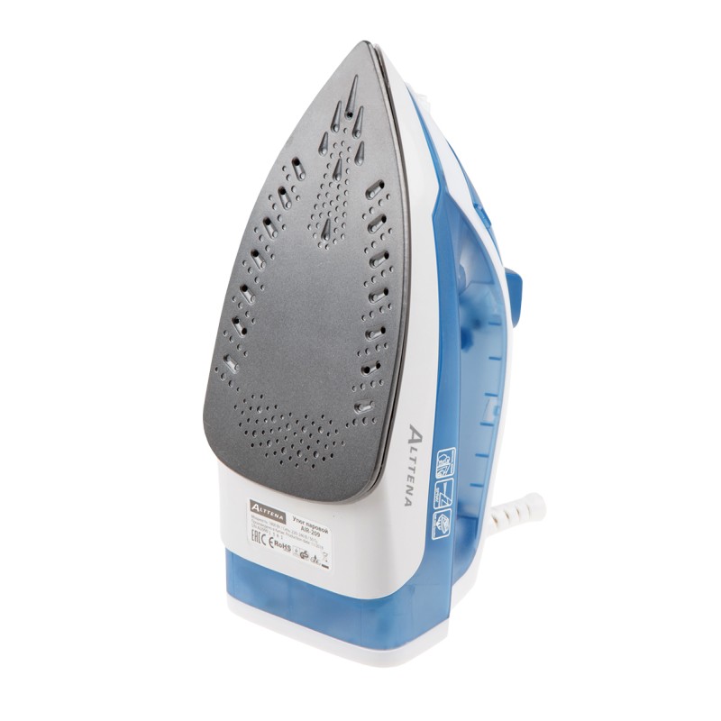 The ALTTENA AIR-209 iron with a power of 1800 W operates in dry ironing and steam ironing modes. Water tank capacity – 150 ml. The soleplate features a Teflon non-stick coating. Includes vertical steaming and a steam boost function for smoothing out tough wrinkles. The appliance is lightweight and compact, weighing only 700 g. A measuring cup is included.