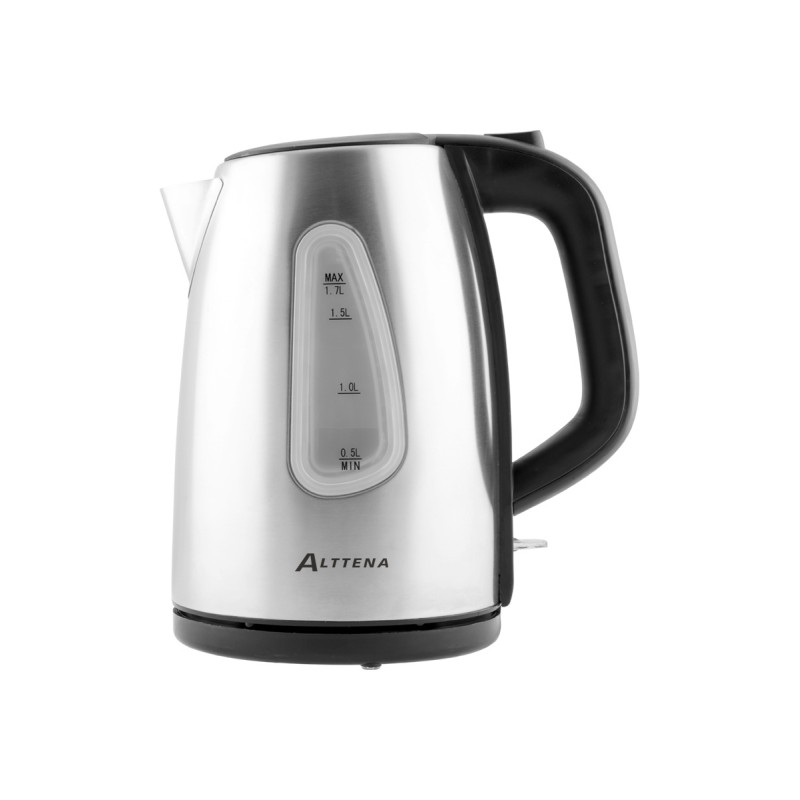 The ALTTENA AKL-142 electric kettle is designed for heating and boiling water, and preparing hot beverages. The built-in controller automatically switches off the kettle when the water reaches boiling point. For user convenience, the kettle is equipped with a base featuring a cable storage compartment, keeping the power cord tidy during use. The concealed heating element ensures even heating and is protected from limescale buildup. The ability to rotate the kettle on its base and the presence of LED lighting enhance user convenience. The appliance's body is made of stainless steel. A window in the body allows you to monitor the water level.