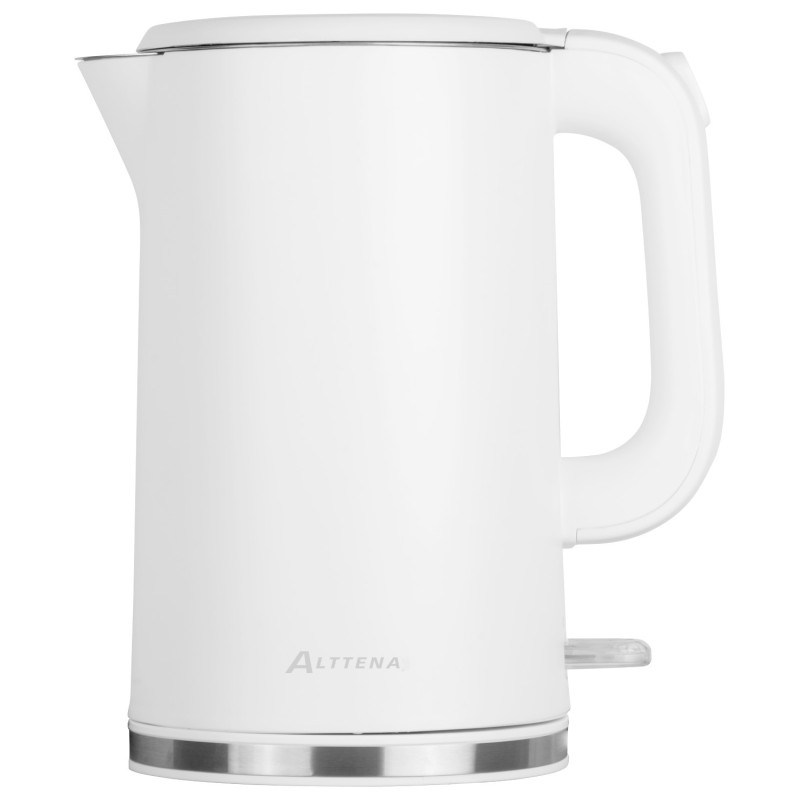 The ALTTENA AKL-521 electric kettle from the ExtraSafe Double Wall series features a double-walled construction. The inner flask is made of stainless steel, while the outer layer is high-quality plastic. The kettle retains heat for a long time, and the outer surface remains cool to the touch. The internal shape of the lid minimizes condensation buildup. It includes a convenient button for opening the lid. The power base features a cord storage compartment to save space on your kitchen counter. The concealed heating element ensures even heating. The kettle can rotate 360 degrees on its base for easy use.