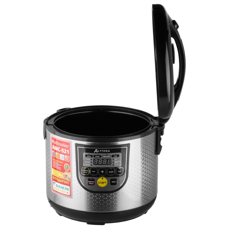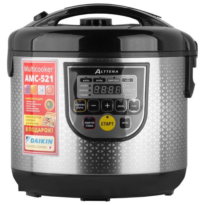 The ALTTENA AMC-521 multi-cooker comes with 10 automatic programs and an included recipe book to diversify your menu. You can use the SMART CHEF function for manual program customization. The appliance's exterior is made of stainless steel with a decorative finish. The removable 5-liter bowl features a Daikin (Japan) non-stick coating. The set includes a steaming basket and a deep-frying basket.