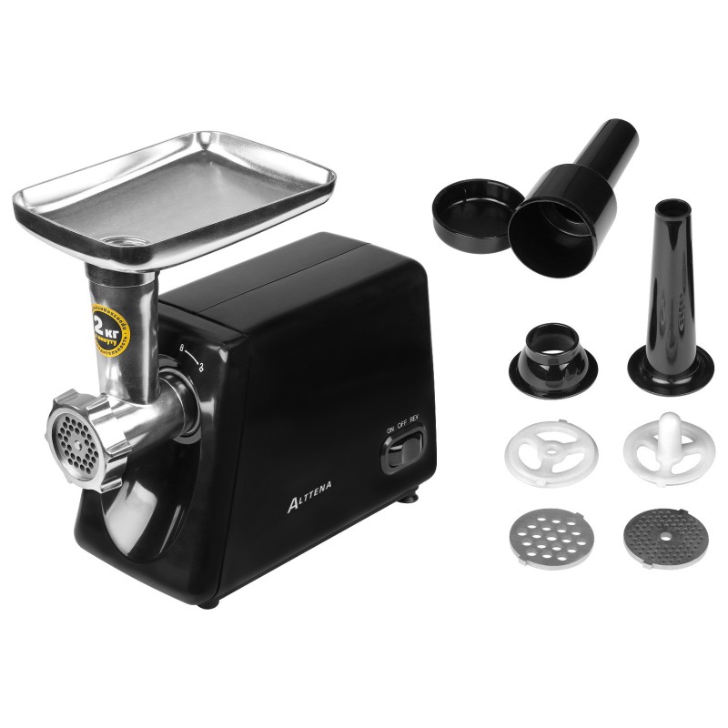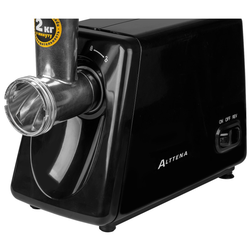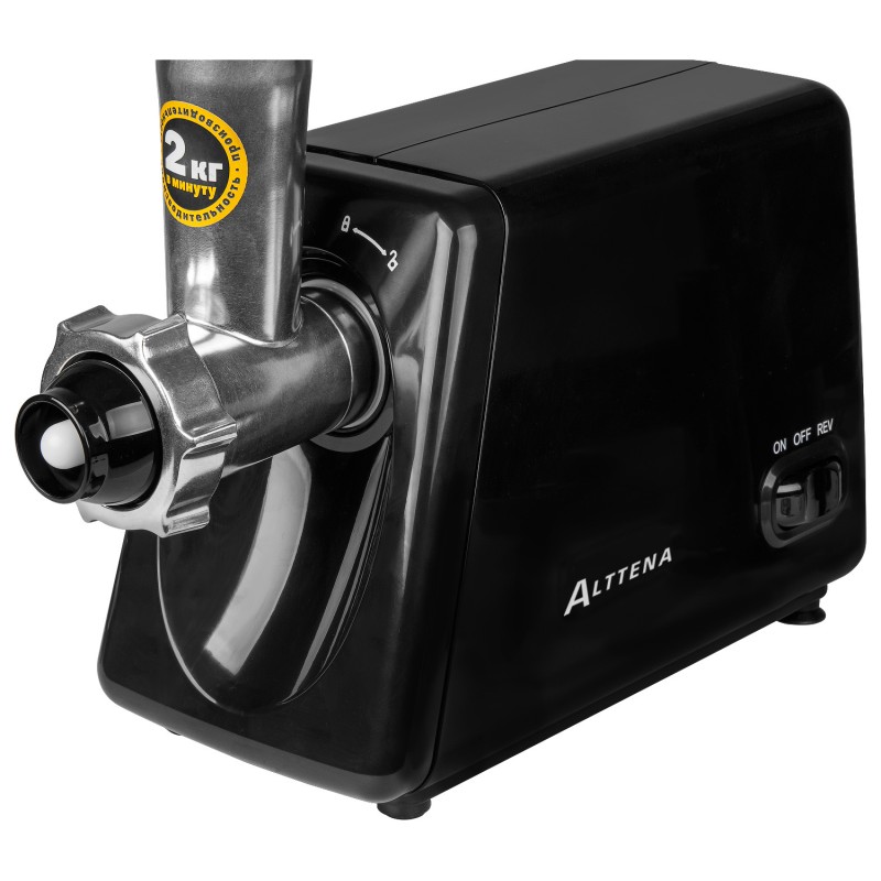 The ALTTENA AMG-352 is an electric meat grinder featuring a reverse function, a convenient quick-release feed tube, and a metal loading tray. A special compartment in the pusher handle is provided for storing small parts. The appliance has a maximum power of 1800 W under shaft lock. The HelixMotion spiral notch system inside the feed tube ensures better performance compared to standard meat grinders. The EasyClip feed tube mounting system ensures simple and convenient maintenance after each use. Includes motor overload protection.