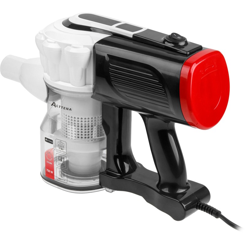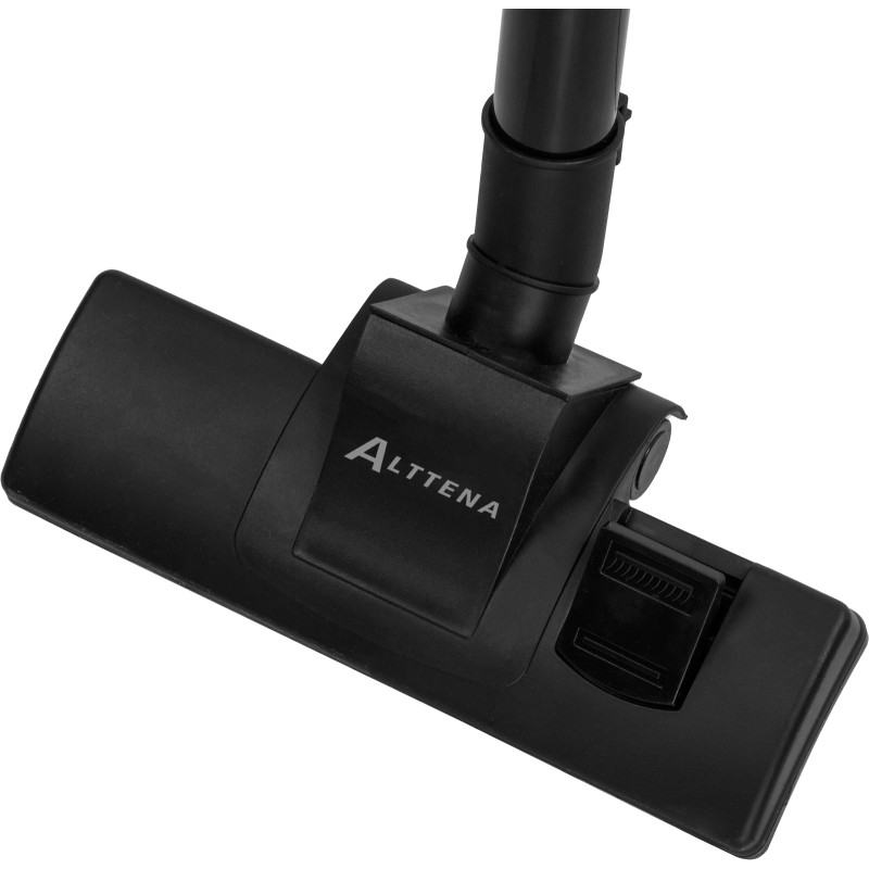 The ALTTENA AVC-513 (N16012-2) vacuum cleaner features a sleek design, a powerful motor, and convenient wall-mounted storage. The set includes a combo floor/carpet brush and a combo crevice tool. The 5 m power cord eliminates the need to constantly switch outlets when moving from room to room. For daily bin emptying, you won't have to touch the dirt—simply press one button to open the lid and empty the debris. It also supports handheld cleaning without using the extension tube.
