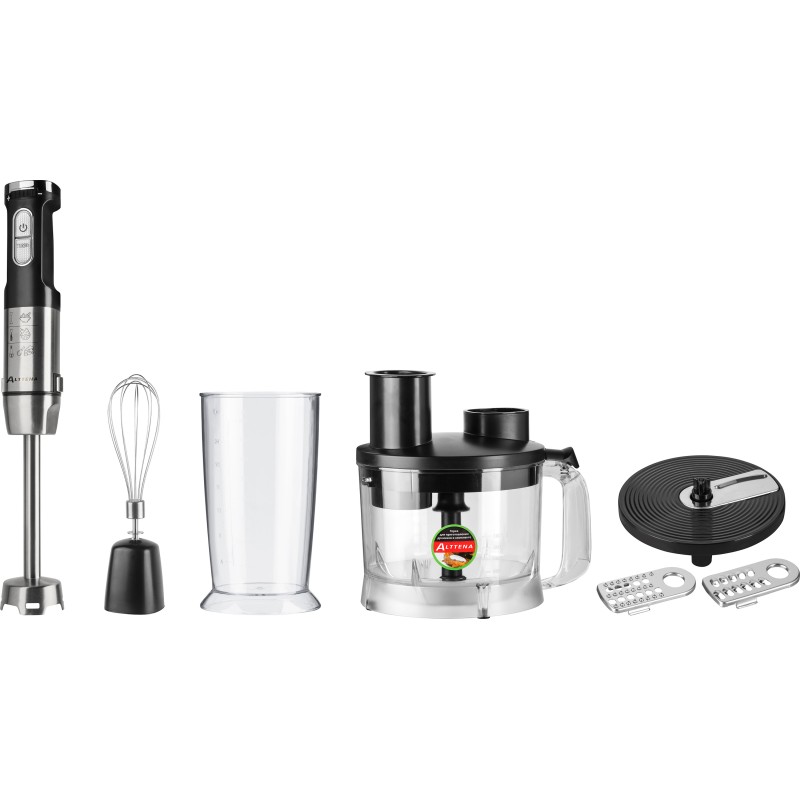 The ALTTENA AHB-812 is a 1200W immersion blender. It will become an indispensable helper in your kitchen. The body of the immersion part and the blade are made of stainless steel. The set includes an 800 ml measuring cup, a whisk for beating and mixing liquid products, as well as a 1.4 L food processor bowl and a rotating disk with three graters (pancake grater, coarse grater, and shredder). The blender is equipped with a rotary speed control and illuminated control buttons. Turbo mode allows you to quickly turn very soft and delicate products into puree. It is activated at the end of the process to finish the work quickly and with quality. This appliance is equipped with overload protection. In case of overheating, the blender turns off automatically.