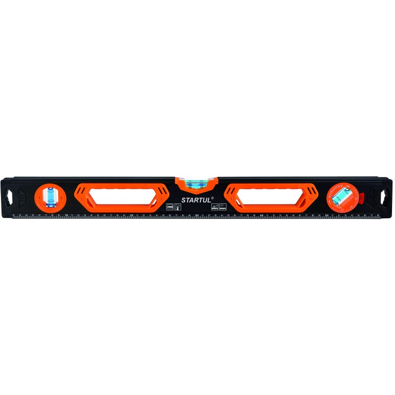 The STARTUL Profi ST2550-100 box beam level is a versatile and durable tool designed for professional construction, carpentry, and installation work. Its 1000 mm length provides a reliable reference for checking level and plumb on doors, windows, framing, and longer surfaces. The high-visibility vials and the inclusion of a rotating angle vial make it a practical tool for a variety of tasks on the job site.