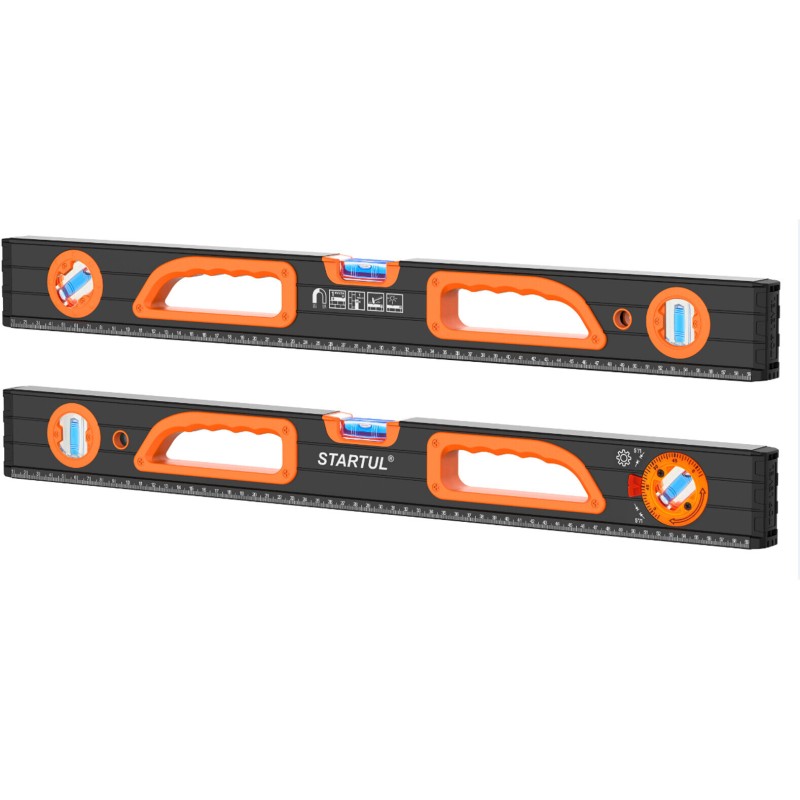 The STARTUL Profi ST2560-100M magnetic box level is a versatile professional tool designed for metalworking, pipefitting, and installing fixtures on ferromagnetic surfaces. Its integrated strong magnets provide secure, hands-free attachment to steel beams, pipes, and cabinets. The 1000 mm length, high-visibility vials, and rotating angle vial make it ideal for a wide range of precise leveling and plumbing tasks.