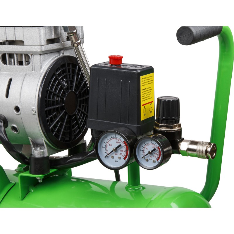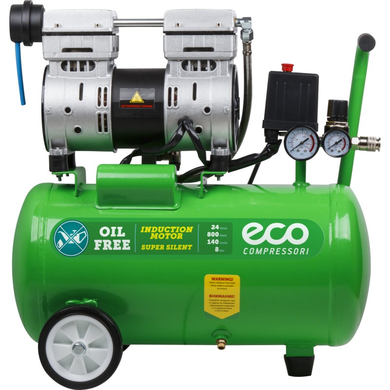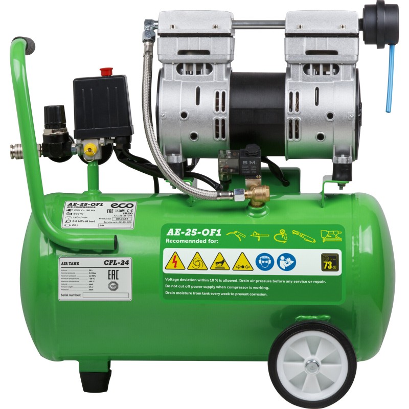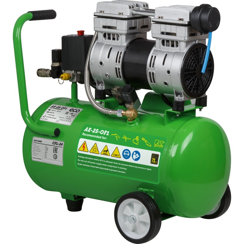 The ECO AE-25-OF1 Oil-Free Compressor does not require oil filling for use. It features low noise levels, a 2-cylinder design, a pressure regulator, an electromagnetic valve, metal-cased pressure gauges, an additional air tube to reduce noise, and an air filter with a paper filter element.