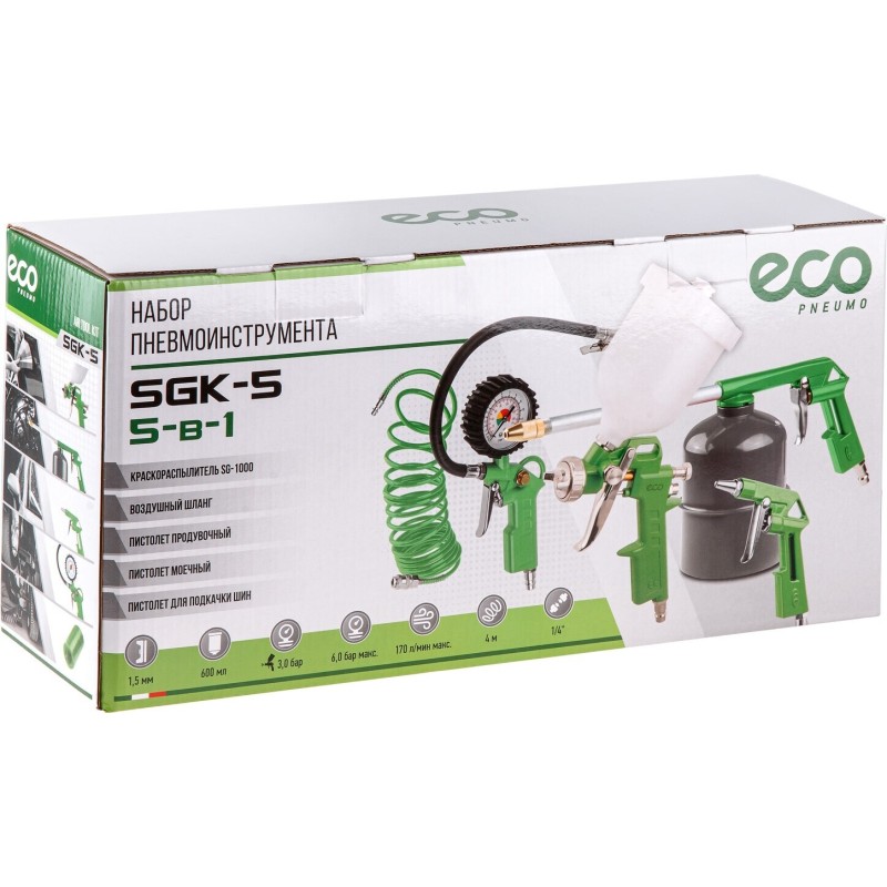 The ECO SGK-5 is a versatile starter kit containing essential pneumatic tools for various workshop and DIY tasks. This all-in-one set is perfect for car enthusiasts, homeowners, and hobbyists looking to utilize an air compressor.