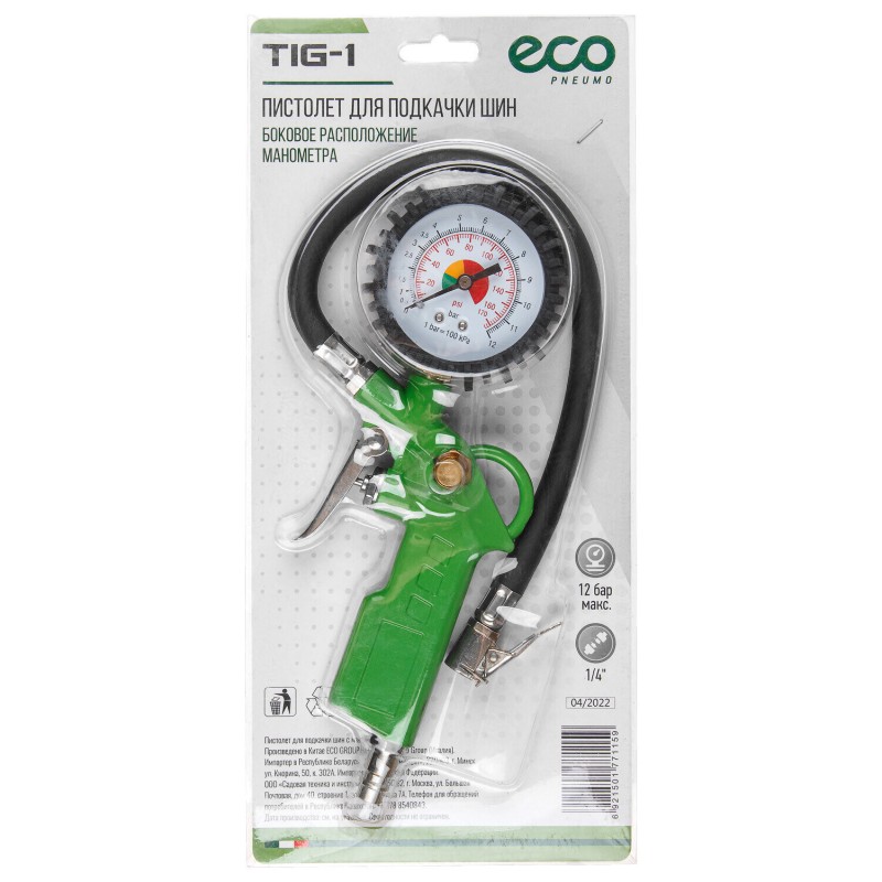 The ECO Tire Inflator Gun is made from high-quality materials, offering a high degree of reliability and durability. The gun is equipped with a pressure gauge to monitor tire pressure and a flexible rubber hose with a quick-release chuck for accessing recessed valves and valves located on the inner wheels of dual truck tires. The gauge can measure pressure in the range of 0-12 bar. The gun connects to other equipment via a G1/4" internal thread. A male quick-connect fitting is supplied with the gun.