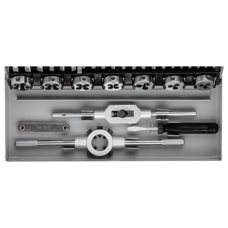 Set Contents Taps (3 per size): 21 pcs. (Taper #1, Plug #2, Bottoming #3 for sizes: M3x0.5, M4x0.7, M5x0.8, M6x1.0, M8x1.25, M10x1.5, M12x1.75) Dies: 7 pcs. (Matching sizes: M3, M4, M5, M6, M8, M10, M12) Holders: 1 T-handle Tap Wrench, 1 Die Stock (Plakholder) Accessories: 1 Thread Pitch Gauge, 1 Screwdriver Total Pieces: 32 pcs.