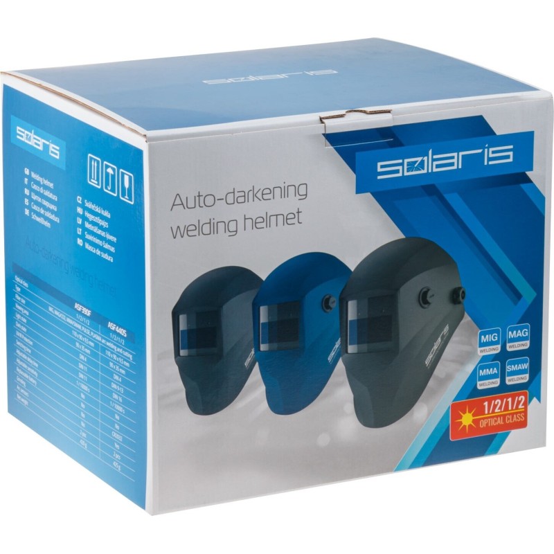 The SOLARIS ASF390F Auto-Darkening Welding Helmet is designed to protect the welder's eyes, neck, and face from light and IR/UV radiation during welding. Suitable for beginners and occasional work. Two light sensors guarantee activation in various welding conditions. The solar panel ensures stable power for the electronics during operation. This model is convenient because the filter automatically darkens when the arc is struck. Advantages: high optical class 1/2/1/2; 2 light sensors; large viewing area 90x35 mm; elastic impact-resistant plastic; extended protection area for the neck, ears, and head. UV/IR protection: up to 11 DIN. Power: solar panel, non-replaceable lithium battery. Storage temperature: -20°C - +70°C. Shell material: impact-resistant plastic / polyamide (nylon). Outer protective lens: 115x104 mm; inner protective lens: 96x42 mm. Application: MIG, MAG/CO2, SMAW, MMA, air-carbon cutting, pulse welding, plasma welding and cutting.