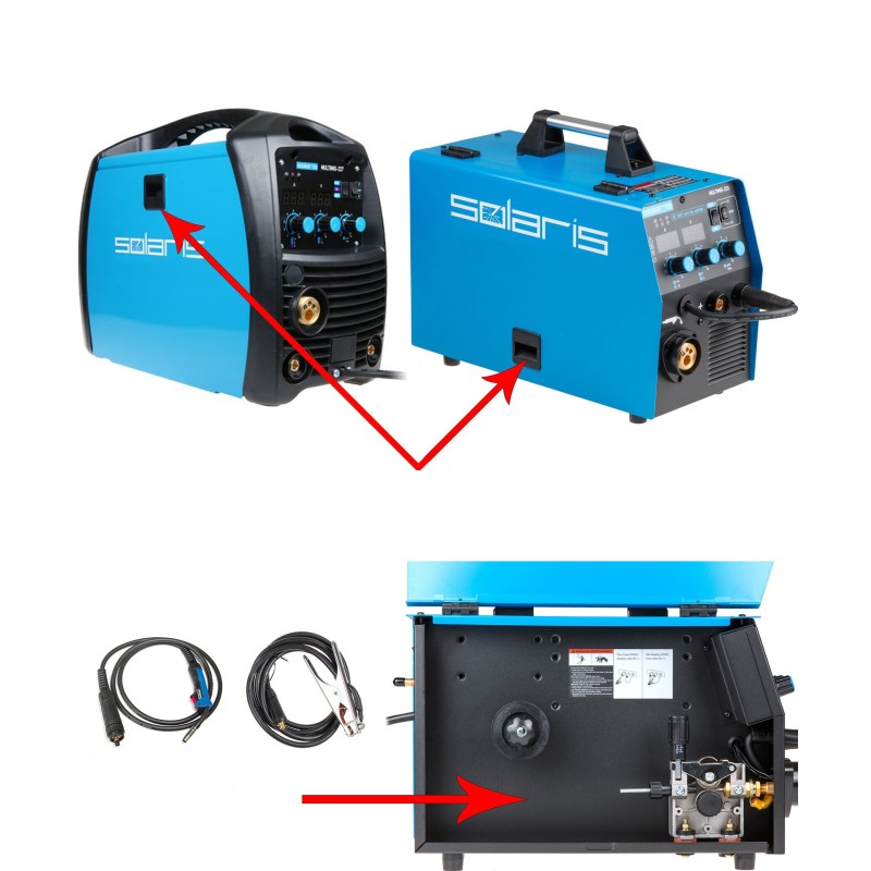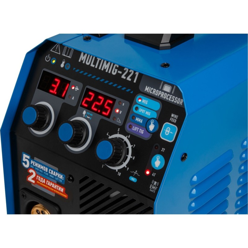 The SOLARIS MULTIMIG-221 Welding Inverter operates on 4 IGBT transistors, making it a reliable solution. 5-in-1: MIG / SPOT MIG / FLUX / MMA / TIG lift DC. Microprocessor control. Accepts spools up to 5 kg / 200 mm. Wire feed/inching button (without voltage) - safe for the operator. Polarity change capability for gasless flux-cored (FLUX) wire welding. Stable operation in low-voltage networks (from 160V). 2T/4T trigger modes (for MIG). SPOT welding mode (spot welding with duration from 0.1 to 10 seconds). Adjustable Arc Force (for MMA). EMI filter to protect other devices from interference.