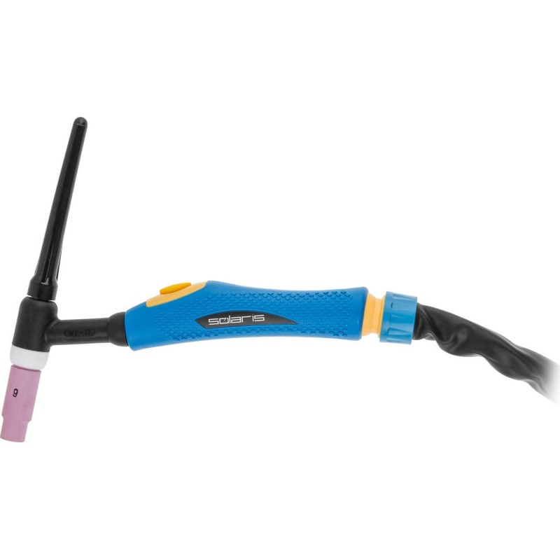 The SOLARIS TIG-200P Welding Inverter comes with a 3-meter TIG torch. The TIG torch is equipped with a control switch. TIG - welding with a non-consumable tungsten electrode in a shielding gas environment (primarily argon) with direct current (DC) is used for welding any carbon, low-alloy or high-alloy steel, including stainless steel, and heavy non-ferrous metals such as copper, nickel, titanium (except aluminum) and their alloys. TIG welding allows for neat, precise, and fine welds, which are difficult to achieve with other welding modes.